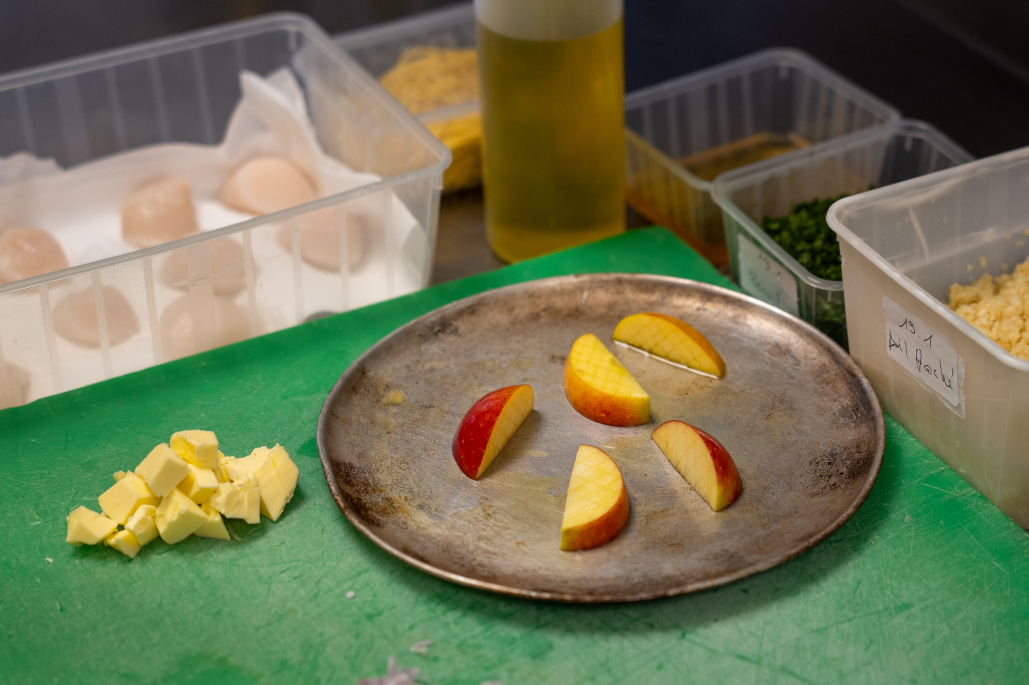 Coupez la demi-pomme en quartiers, en gardant la peau. Dans une seconde poêle, faites fondre une noisette de beurre et faites rôtir les pommes 3 à 4 minutes, jusqu’à ce qu’elles soient bien colorées mais encore légèrement fermes. Elles apporteront une touche fraîche et sucrée, parfaitement équilibrée avec la sauce crémeuse et le calvados.