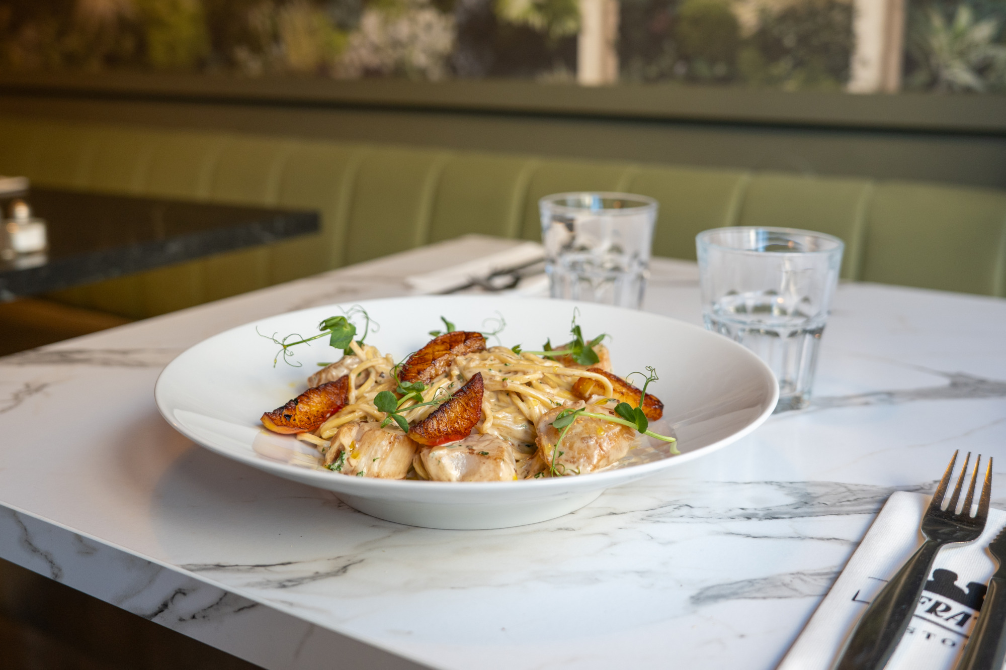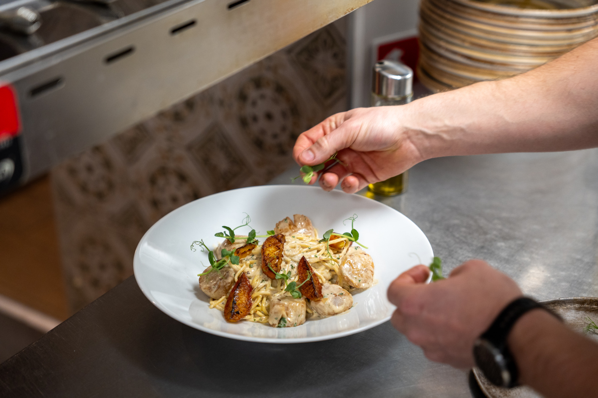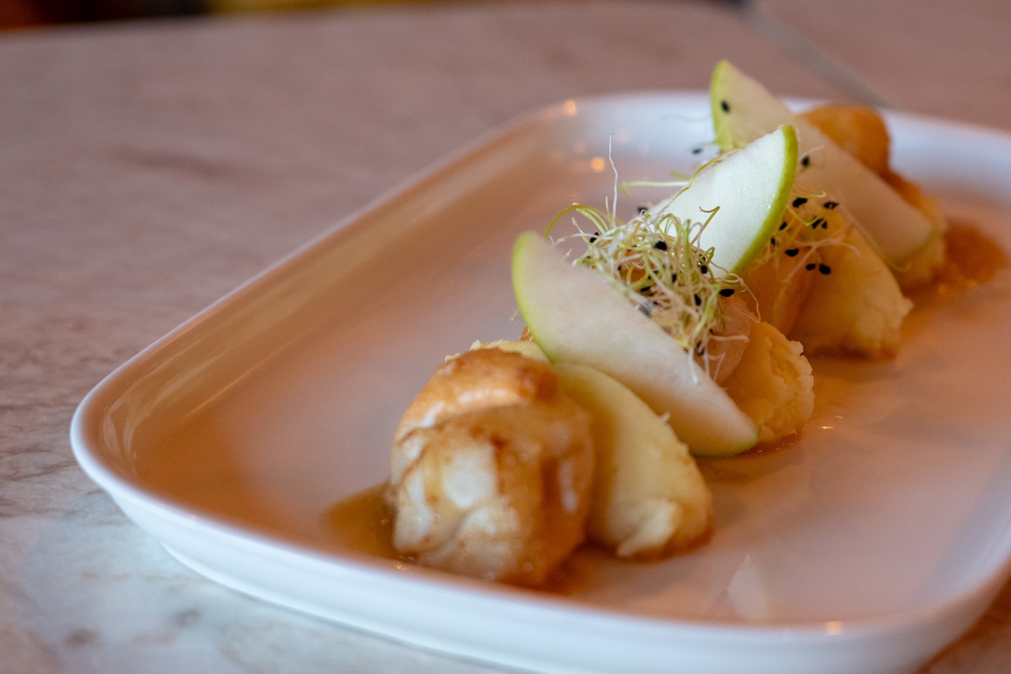 Enroulez les spaghettis dans l’assiette, disposez les Saint Jacques bien dorées, ajoutez les quartiers de pommes, quelques pousses de pois et un filet d’huile d’olive pour sublimer l’ensemble.