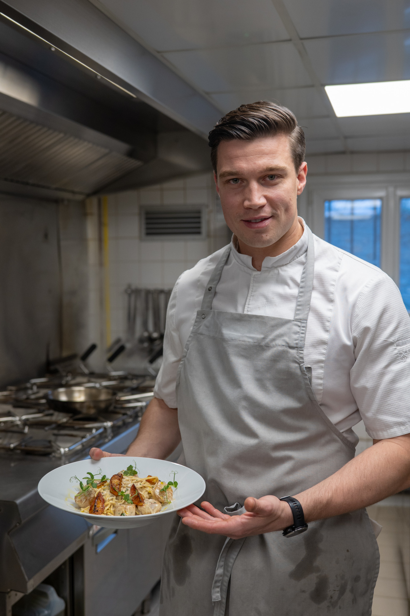 En cuisine, Valentin veille à une juste coloration et à un cœur moelleux, tandis que l’accompagnement – notamment l’écrasée de rate du Touquet montée à la crème – reste volontairement discret pour ne jamais dominer la Saint‑Jacques. Quelques pousses de poireaux finalisent l’assiette avec sobriété.