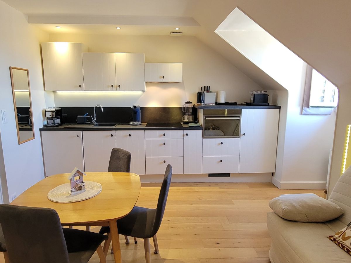 Au 3ème et dernier étage sans ascenseur, cet appartement, d’une capacité de 4 personnes, est composé d’une pièce principale avec cuisine aménagée tout équipée (lave-vaisselle, lave-linge, plaques vitrocéramiques, four, blender, grille-pain, cafetière filtre et Senseo…), canapé-lit convertible, TV ( Molotov, Netflix, Canal+) et wifi. Les condiments essentiels pour cuisiner sont fournis.